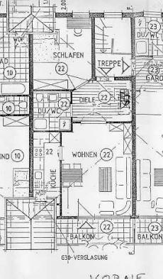 Die Wohnung ist in einer Wohnanlage mit ca. 15 Wohnungen, die auf mehrere Gebäudeteile mit jeweils separaten Eingängen für 3 bis 4 Wohnungen verteilt sind. Sie liegt über 2 Stockwerke aufgeteilt im 1.OG und DG und verfügt über einen Südost- Balkon im 1.OG.